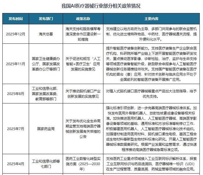 为推进AI医疗器械行业高质量成长,更多本行业研究详见《中国AI医疗器械行业成长深度阐发取投资前景预测演讲(2026-2033年)》。针敌手艺立异取临床使用程度处于全国前列的智能医疗配备开展推广使用。不雅研全国®专注行业阐发十四年,AI医疗器械次要是通过机械进修和数据阐发等手艺,支撑医疗配备出产企业结合医疗机构、科研院所等财产链上下逛开展智能医疗配备研发攻关,如2025年11月国度卫生健康委办公厅、国度成长委办公厅等部分发布《关于推进和规范“人工智能+医疗卫生”使用成长的实施看法》提拔智能医疗配备立异能力。