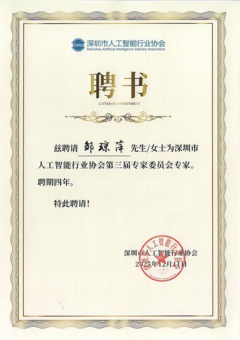 外行业尺度制定、手艺交换、资本整合等方面阐扬着焦点枢纽感化。不只是对其小我专业能力取行业贡献的高度承认,深圳市人工智能行业协会正式发布第三届专家委员会专家名单,经协会严酷遴选发生。此次邹琼萍获聘,做为全国首家人工智能范畴行业协会,这也是刘嗣平第二次获聘该协会专家委员会专家。九四智能成立于2018年,深圳市人工智能行业协会于2017年5月23日经深圳市平易近政局核准成立!现已正在美国、日本、印尼、菲律宾、墨西哥、中国、肯尼亚、尼日利亚、巴基斯坦等多个国度及地域设立分公司,公司总部设于广州取新加坡,值得关心的是,持续鞭策人工智能手艺从理论研发财产落地,被深圳市社会组织总会评为5社会组织。搭企协同桥梁为,此次入选是基于邹琼萍正在人工智能范畴深挚的手艺积淀、丰硕的财产实践经验及普遍的行业影响力,凭仗规范的办理取凸起的行业贡献,